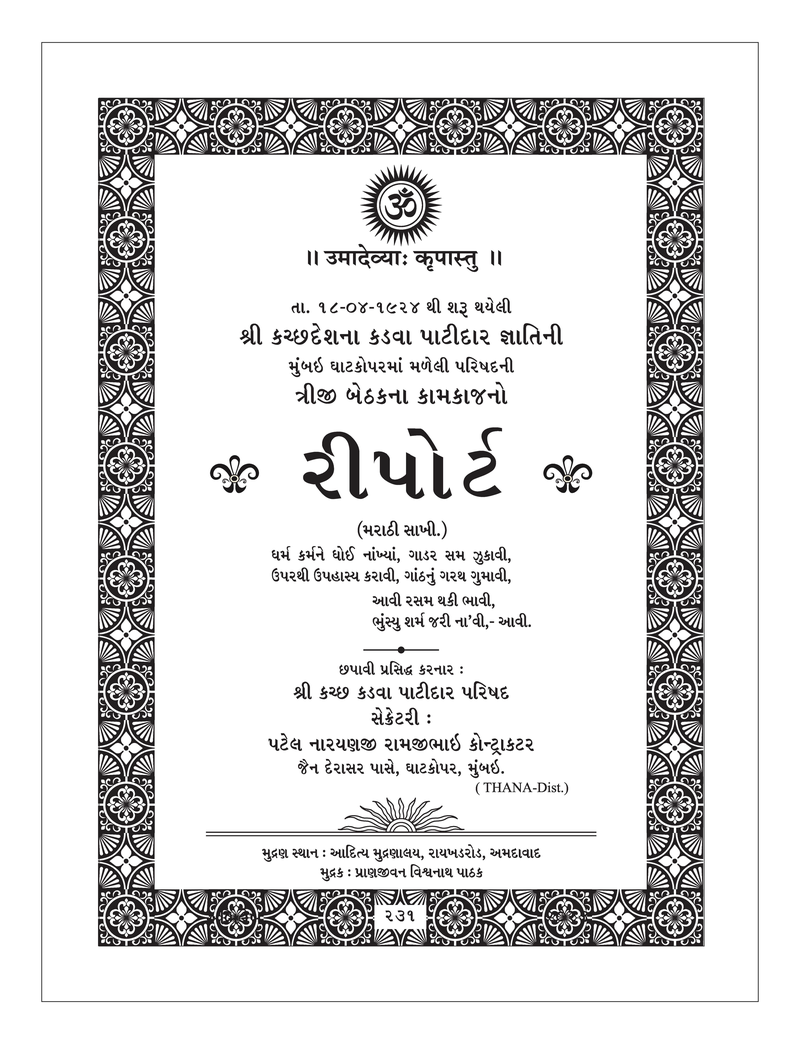 શ્રી કુળદેવીની કૃપા વડે શ્રી કચ્છ કડવા પાટીદાર પરિષદની ત્રીજી બેઠકનો રિપોર્ટ પ્રસિદ્ધ કરવાનું ભાગ્ય મને પ્રાપ્ત થાય છે. પરિષદનો ઉદ્દેશ ગર્ભમાં રાખી કામ કરવાનો દુઃખ દાયક સમય હવે રહ્યો નથી. પરિષદે પોતાનો ઉદ્દેશ જાહેર કર્યો છે, તે પાર પાડવાના ઠરાવો પણ કર્યા છે અને પરિષદના સુકાનીઓ કાર્ય વાહકો તે ઉદ્દેશ સાધ્ય કરવાના માર્ગો પણ જોઈ શક્યા છે વગેરે રિપોર્ટના અવલોકનથી સમજી શકાય તેમ છે. આગેવાનો હવે જરૂર સમજતા થશે કે પોતાના સ્વાર્થની ખાતર જ્ઞાતિના અજ્ઞાન ભાઈઓને ગમે તે રીતે હેરાન કરી શકાય નહિ અને કડવા પાટીદાર જેવી ઉચ્ચ કોમને પીરાણાના અધર્મ યુક્ત પંથમાં ડૂબતી રાખી પોતાની સત્તા જમાવી રાખવાનો જમાનો હવે વહી ગયો છે. જે ગેઢેરાઓ આજે જ્ઞાતિમાં પોતાની લાગવગનો ઉપયોગ ભાવતી રીતે કરી રહ્યા છે તેઓ જ્ઞાતિનું હિત વિચારી સ્વજ્ઞાતિને શોભતો માર્ગ ગ્રહણ કરે અને પીરાણાપંથના કલંકમાંથી જ્ઞાતિને બચાવી લે તો આપણા કચ્છ વિભાગની સ્થિતિ ઘણી ત્વરાએ સુધરી જાય. આગેવાન કિંવા ગેઢેરાનું સ્થાન જ્ઞાતિમાં ઘણું ઉચું હોઈ શકે પરંતુ તે ક્યારે કે જ્ઞાતિના દુઃખમાં તેઓ ભાગ લેવા તૈયાર થાય અને સુધારક મંડળના ભાઈઓની માફક તેમના હૃદયમાં પણ જ્ઞાતિ હિતની વાસના પ્રદીપ્ત થાય. આ સ્થિતિના અભાવે પરિષદને આગેવાનો સંબંધીનો ઠરાવ કરવો પડે છે. કોઈ પ્રકારની તેમના પ્રત્યેની ઈર્ષ્યા કે શોખની ખાતર તે કંઈ કરવામાં આવતો નથી, પણ જ્યારે “વાડ વેલાને ખાય” એવી સ્થિતિ જોવામાં આવે ત્યારે જ્ઞાતિ હિત સાધવાનું કાર્ય મુશ્કેલ થઈ પડે અને તે માટે જે સત્ય હકીકત હોય તે જાહેર કરી તેના માર્ગ ગ્રહણ કર્યા સિવાય ચાલે જ નહિ. એટલા માટે હું આશા રાખું છું કે જે જે આગેવાન કે ગેઢેરાઓને આ રિપોર્ટ મળે તેમણે જ્ઞાતિની જે અધોગતિ થઈ રહી છે તેના ઉપર ખ્યાલ કરવો અને પરિષદના કાર્યમાં પોતાથી બનતી મદદ કરવામાં જ તેમની મોટાઈ અને ધર્મ રહેલો છે એ વાત તેમને મન, વચન અને કર્મથી સ્વીકારી લેવી. પરિષદના સેક્રેટરી તરીકે હું તેમને વિનંતી કરું છું અને આશા રાખું છું કે તેઓ પરિષદ એટલે સ્વકોમ અથવા પોતાની જ્ઞાતિ પ્રત્યે બહુ મમતા ભરી અને શુદ્ધ લાગણી ધરાવતા થશે તે સાથે જ્ઞાતિના શિરે જે પીરાણાપંથનું કલંક છે તેનો ત્યાગ કરી પોતાના જાત ભાઈઓને મુમના બનાવાના અઘોર પાપમાંથી મુક્ત થશે.